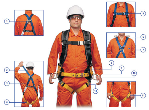 1、墜落防護連接點。2、D形環延長帶。3、向上箭頭指示。4、腿帶。5、胸帶。6、肩部D形環。7、胸部D形環。8、腰部支撐。9、腰帶。10、側面D形環。11、腿部連接。