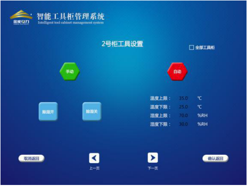 主頁數(shù)據(jù)顯示界面主要顯示的是各個(gè)柜子工具信息,包括柜內(nèi)、外溫濕度、工具名稱、配備數(shù)量、距檢天數(shù)、在位數(shù)量、在位情況等信息。編號(hào)圖標(biāo)顯示紅色則表示離位,綠色則表示在位。上下頁按鈕可進(jìn)行各柜子頁面切換。該界面還配有開門、設(shè)置、查詢界面的按鈕。狀態(tài)一欄有自動(dòng)、手動(dòng)兩種狀態(tài),表示的是此號(hào)柜中除濕機(jī)的工作狀態(tài)。自動(dòng)狀態(tài)下,當(dāng)溫、濕度達(dá)到設(shè)定的范圍值則除濕機(jī)會(huì)自動(dòng)打開或者關(guān)閉。手動(dòng)狀態(tài)下,可以強(qiáng)制打開或者關(guān)閉除濕機(jī)。