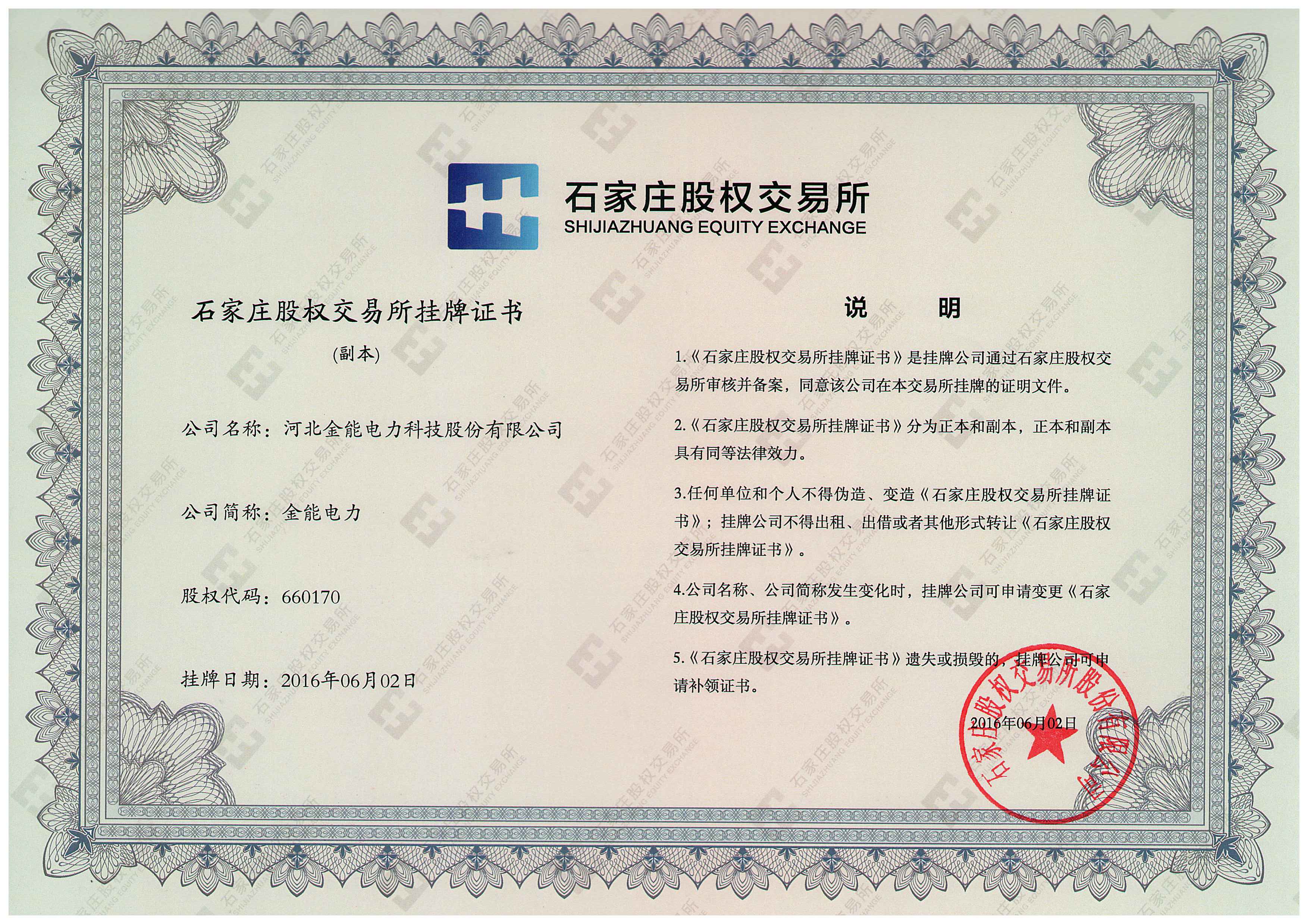 石家莊股權(quán)交易所掛牌證書